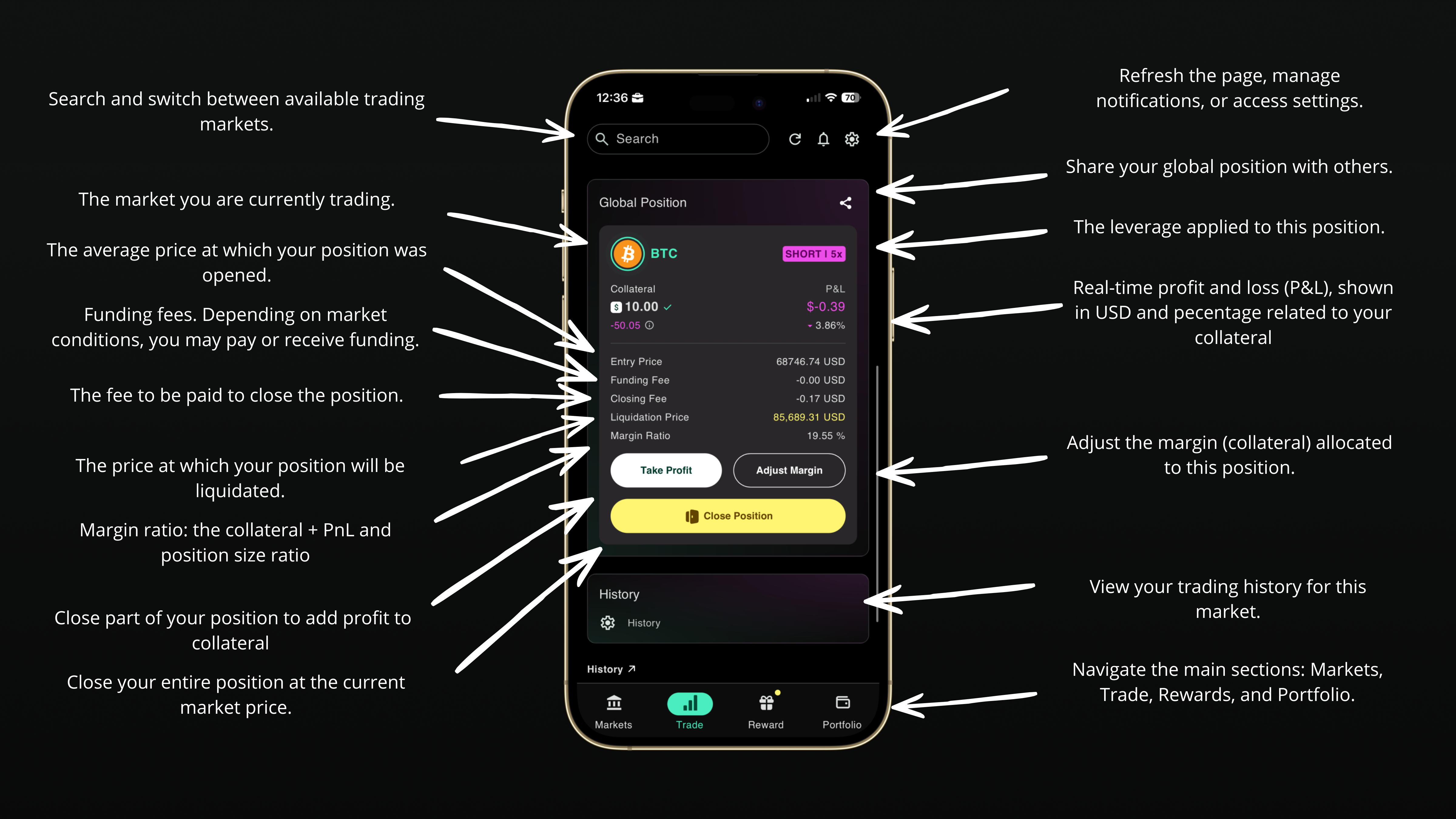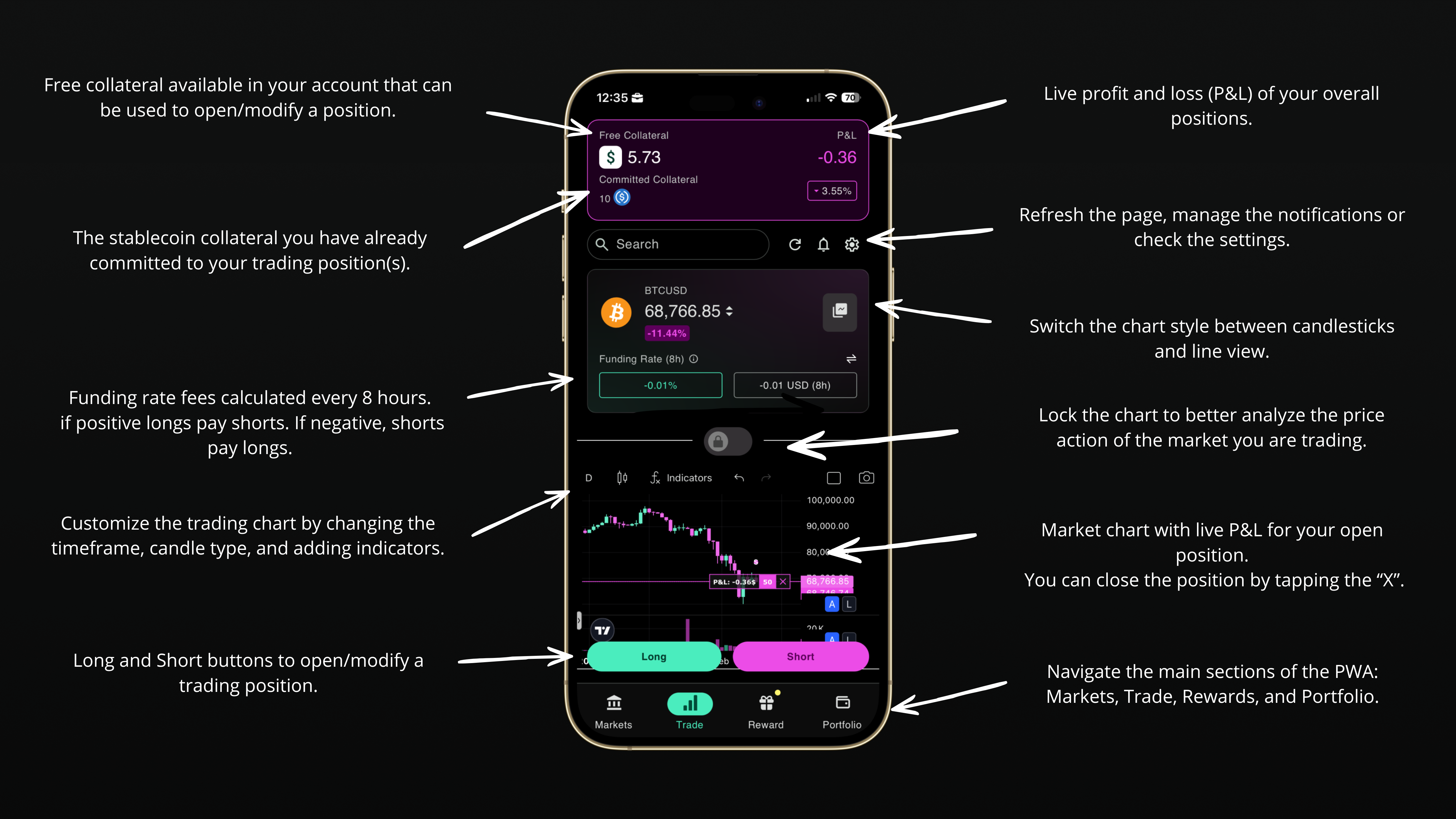 PnL (Profit and Loss) - Difference between the amount of vStable borrowed to open a position and the amount obtained when closing it, adjusted for fees and funding payments.