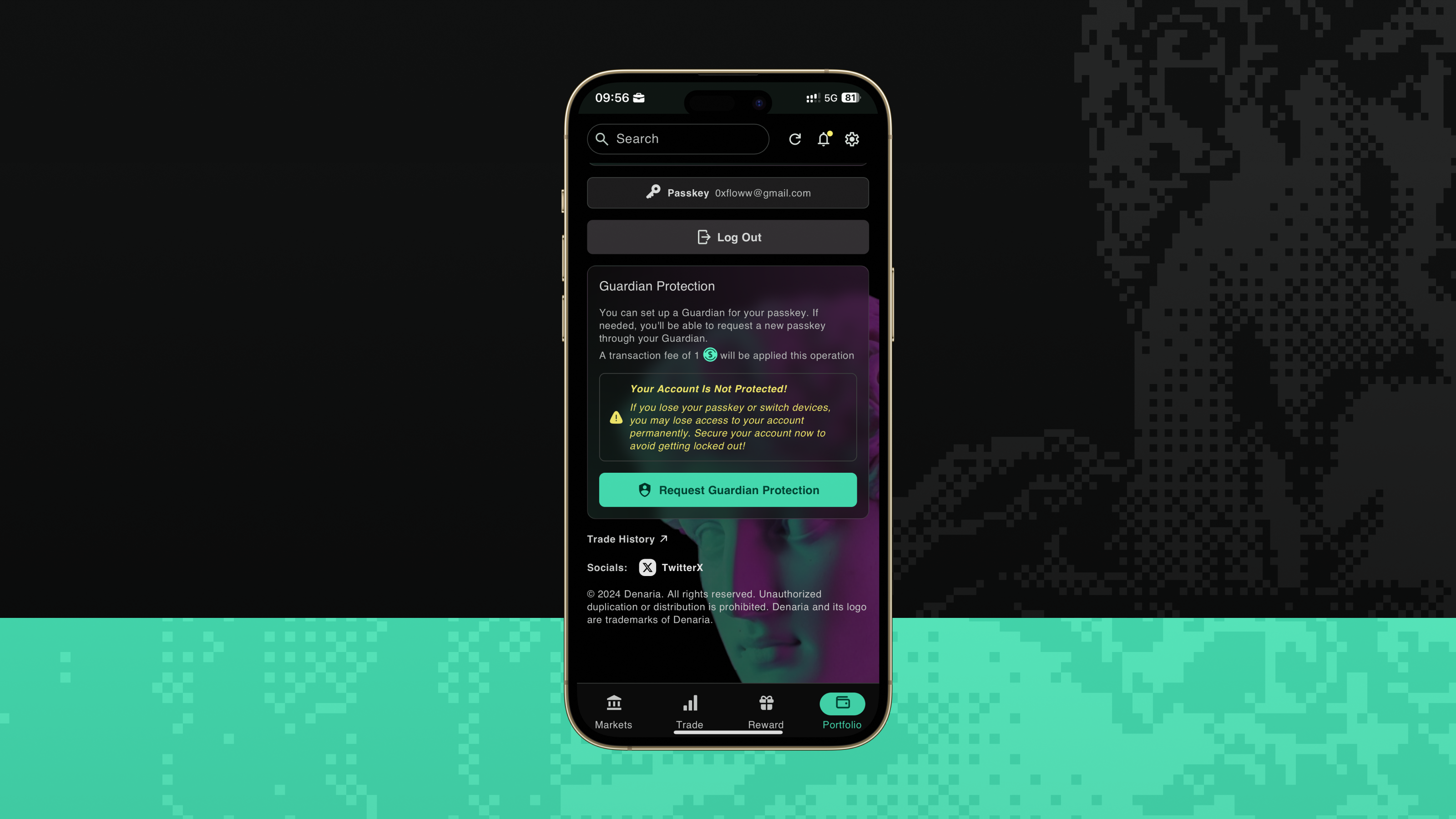 - Users can nominate a trusted smart account as a Guardian (another user on the Denaria App) by email.