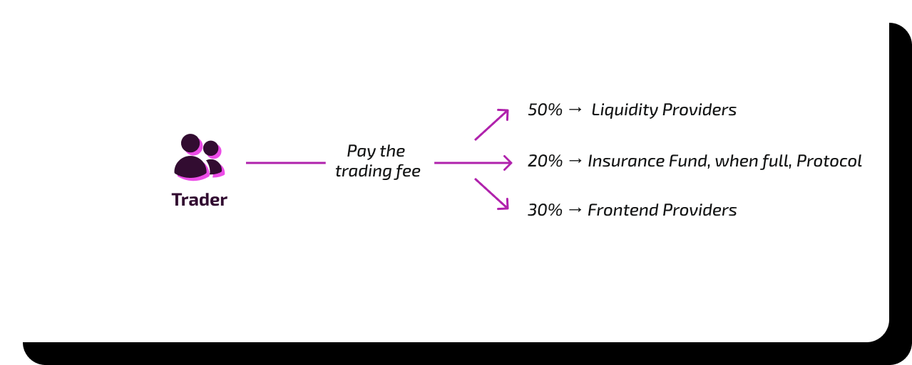 The protocol uses a flexible mechanism to define how fees are allocated. A configurable percentage ϕ of each fee is assigned to the protocol and Insurance fund, while the remaining (1 - ϕ) is distributed to liquidity providers.