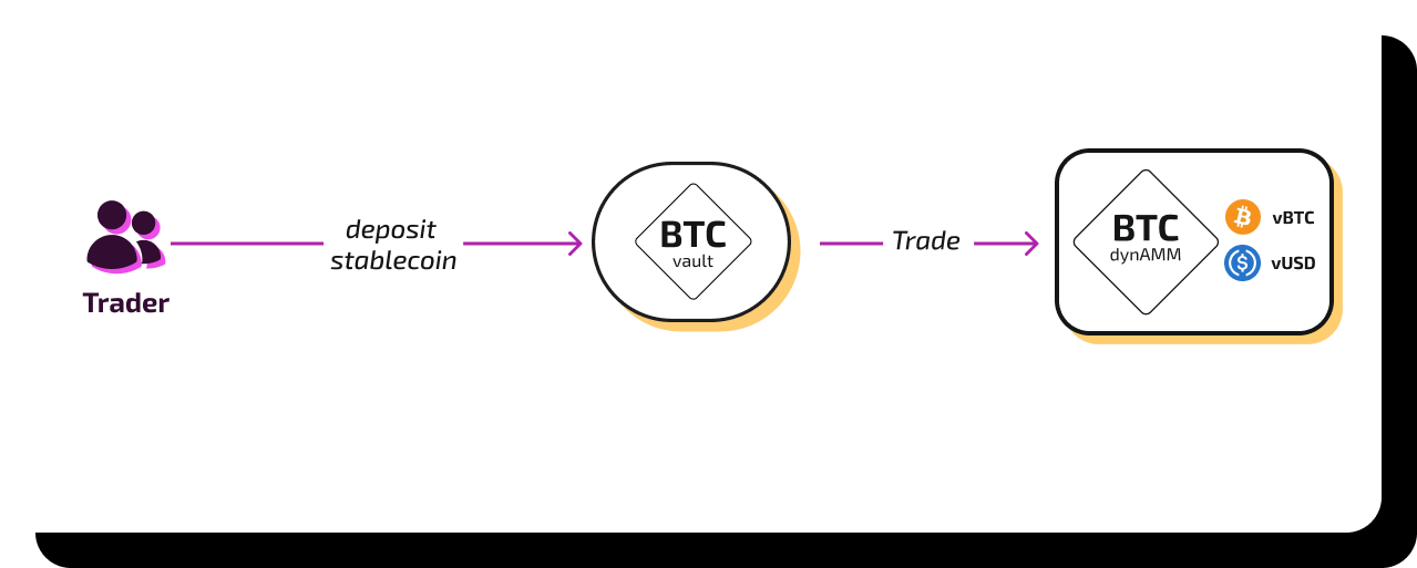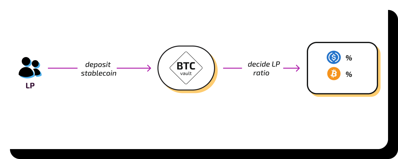 Bob is a liquidity provider with $10,000 in stablecoins. He deposits this amount into the BTC vault, specifying how much he wants to allocate as vStable or vAsset exposure, depending on his strategy.